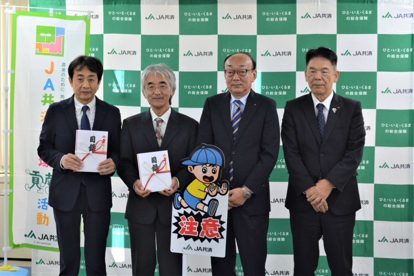 JA共済では、交通事故の削減を目指し、JAを通じて交通事故防止資材を各団体へ寄贈する活動を行っています。この交通事故防止にかかる取組みの一環として、令和5年度は県下83の保育園・幼稚園に飛び出し注意看板を寄贈いたしました。