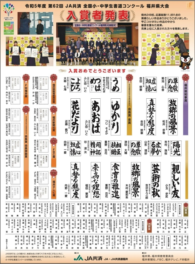 令和5年度JA共済全国小・中学生書道コンクール福井県大会にて入賞された皆さんは、以下画像のとおりです。10月下旬に開催された表彰式では、上位入賞を果たした生徒さんらが出席され、とても華やかな式典となりました。