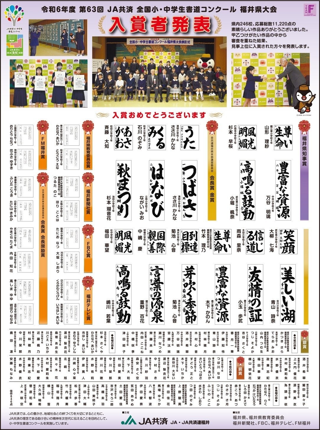 令和6年度JA共済全国小・中学生書道コンクール福井県大会にて入賞された皆さんは、以下画像のとおりです。11月上旬に開催された表彰式では、上位入賞を果たした生徒さんらが出席され、とても華やかな式典となりました。