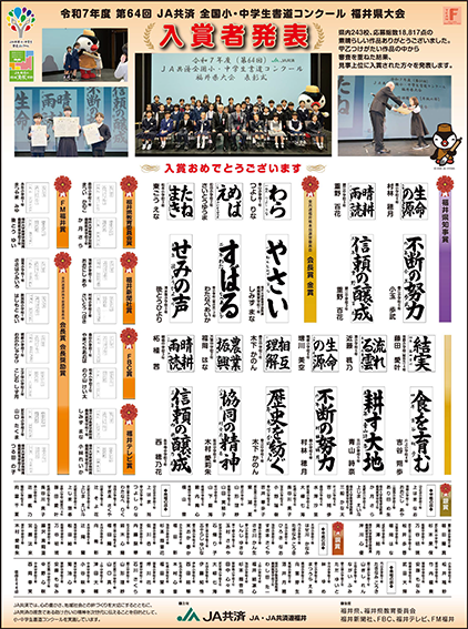 令和7年度JA共済全国小・中学生書道コンクール福井県大会にて入賞された皆さんは、以下画像のとおりです。10月下旬にトレタスグリーンホールにて開催された表彰式では、上位入賞を果たした生徒さんらが出演され、とても華やかな式典となりました。